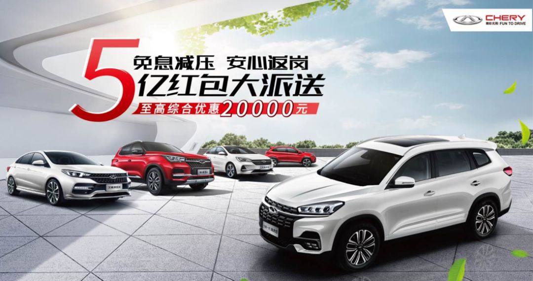 一场突如其来的“疫情”,让很多消费者对汽车的“刚需”被激发出来了,纷纷萌生了购买私家车的念想。为了进一步降低消费门槛,让更多人实现自驾安全出行,奇瑞汽车在3月特别推出了“免息减压、安心返岗,5亿红包大派送”活动,即购买奇瑞全系指定车型,可享受高额优惠。下面就跟随圈哥来进一步了解各款车型的情况吧!