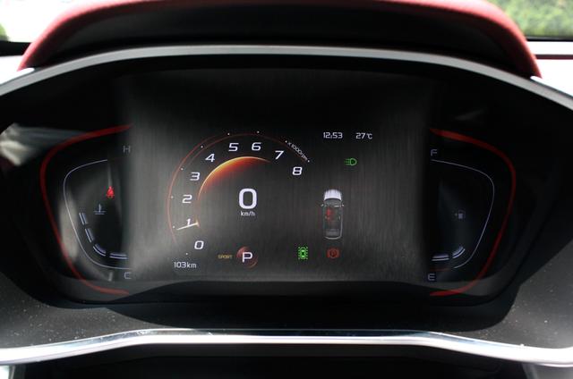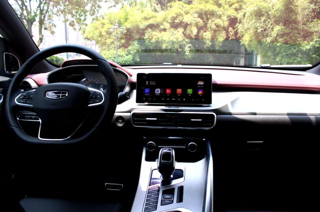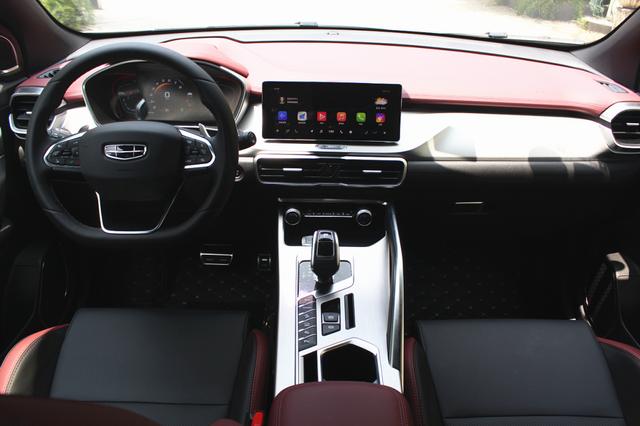 具体来看,新车提供红黑色前格栅,中间配备了吉利的“黑标”,下方还有一块碳纤维纹路装饰,整体前脸看起来极具战斗气息。仔细看可以发现,中间还有个摄像头,下方还有个毫米波雷达,表明这款车型还搭载了ACC自适应巡航,这个价位拥有这项配置可以说吉利十分良心。