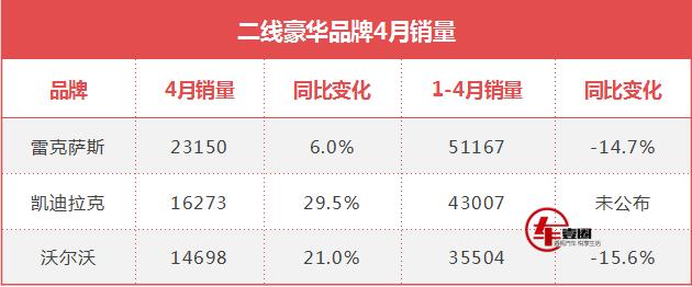 而且值得一提的是,今年一季度雷克萨斯就已经将凯迪拉克拉下了马。今年一季度,雷克萨斯以3.29万辆的累计销量“完胜”凯迪拉克2.75万辆的销量,夺得一季度二线豪华品牌销量冠军。截止今年1-4月份,雷克萨斯累计销量为5.6万辆,而凯迪拉克累计销量为4.37万辆,销量差距明显。