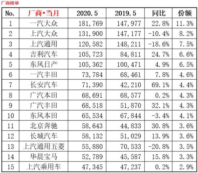 从数据显示来看,5月单月销量站上10万辆台阶的有5家企业,包括一汽大众、上汽大众、上汽通用、吉利汽车、东风日产。值得一提的是,在销量TOP 15的车企中,仅有4家车企出现了同比下滑,其余都呈现不同程度的增长,其中长安表现最为亮眼,同比增长达到69.1%。主流合资品牌与头部自主品牌企业推动整体市场走强,车市马太效应日趋明显。