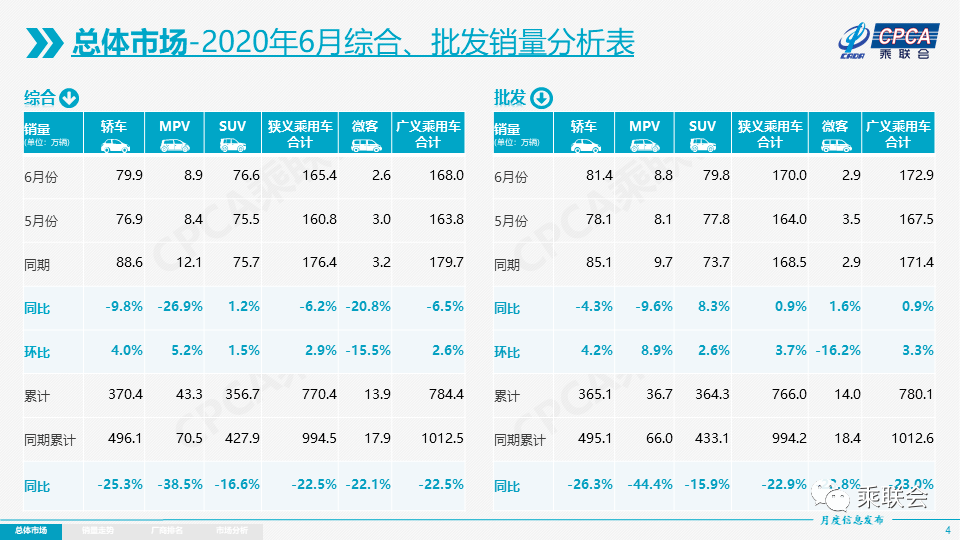 具体来看,6月份轿车销量80.0万辆,同比下降9.6%,环比增长4.1%;6月份SUV销量77.2万辆,同比增长1.9%,环比增长2.3%;6月份MPV销量8.9万辆,同比下降26.7%,环比增长5.4%;6月份新能源狭义乘用车销量8.3万辆,同比下降38.8%,环比增长25.0%。