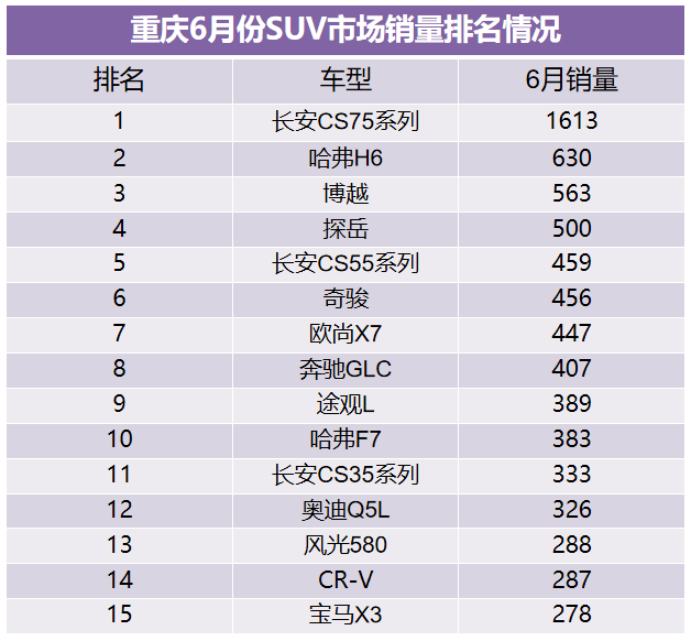 从6月份的SUV榜单上发现,中国品牌优势依旧比较明显。长安CS75系列、哈弗H6、吉利博越分别位居榜单前三。此外,诸如CS55系列、CS35系列、长安欧尚X7、欧尚X70A、哈弗F7、哈弗M6、风光580等车型也都进入了榜单。合资品牌方面,探岳、奇骏、途观L、CR-V同样入围,基本与全国市场一致。而BBA则分别入围了一款车型,分别是奔驰GLC、奥迪Q5L、宝马X3。