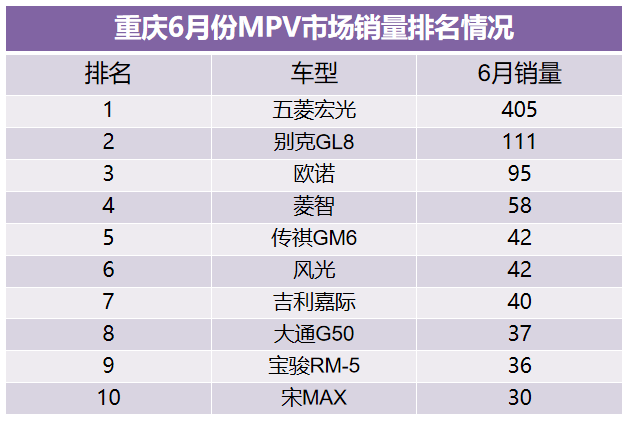 从6月MPV市场的表现来看,整个市场依旧面临比较强的下行压力,单月销量破百的车型近2款,分别是五菱宏光与别克GL8。五菱宏光以绝对的优势,位居榜单第一位;合资方面,仅别克GL8入围了榜单前十。自主品牌方面,欧诺、传祺GM6、吉利嘉际、宝骏RM-5、大通G50、宋MAX等车型进入了榜单,但销量还有很大的提升空间。