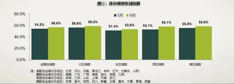 数据显示,6月汽车经销商库存预警指数为56.8%,较上月上升2.6个百分点,较去年同期上升6.4个百分点,库存预警指数位于荣枯线之上。其中,北区指数为59.2%,东区指数为53.6%,西区指数为58.1%,南区指数为58.6%。北方地区疫情反复,促销费政策及车展活动等难以展开,库存压力延续。