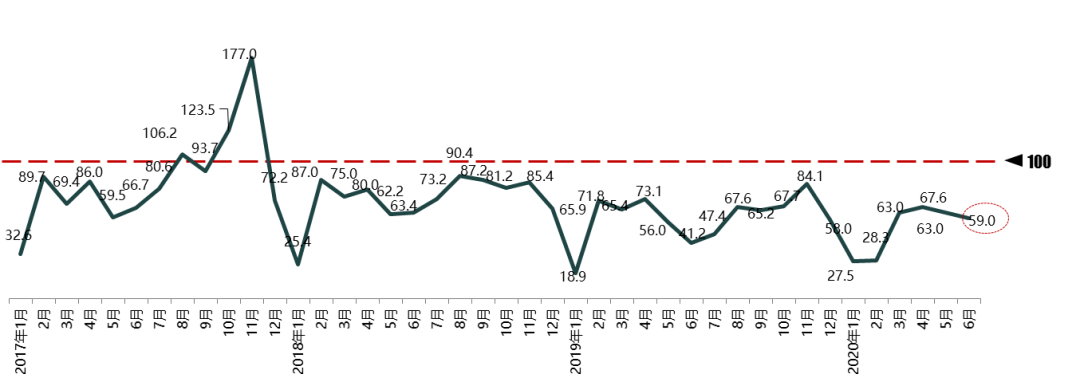 数据显示,6月汽车消费指数为59.0,较上月有所下降;6月入店分指数为58.3,同样低于上月。随着各行业市场回暖,居民消费有部分回升,购买力略有提高,但是购车意向及预算都更谨慎,持币观望氛围较重。从汽车市场来看,在疫情期间抑制的需求基本在第二季度得到释放,疫情后期市场消费基本趋于稳定。