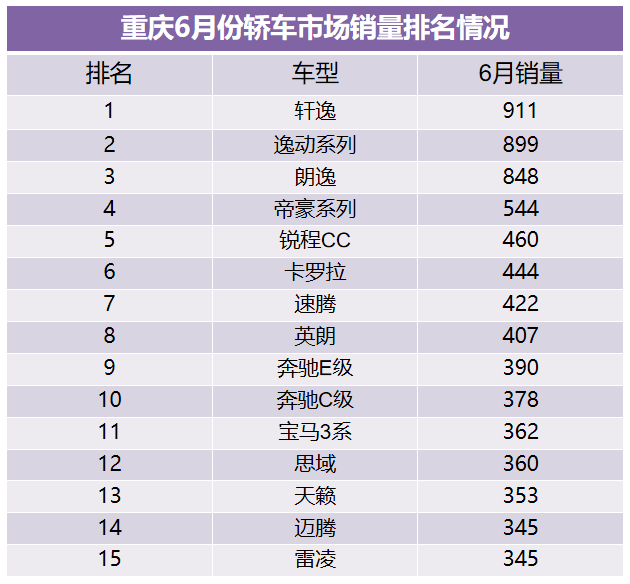 从6月份轿车的销量排名情况来看,日产轩逸以911辆的成绩,超越了长安逸动系列,位居榜单第一位。朗逸、卡罗拉、速腾作为榜单的常客,不用多说。除了逸动之外,帝豪系列也凭借着544辆的成绩,位居榜单第4位。奔驰与宝马同样表现不俗,多款车型入围了榜单,而同一阵营的奥迪显然落伍了。比较有意思的是,天籁以353辆的成绩位居B级车销冠,看来重庆消费者对日产还是情有独钟。
