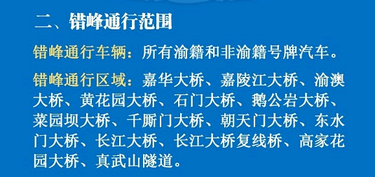 至于错峰通行的范围,主要集中在连接主城区的大桥,包括嘉华大桥、嘉陵江大桥、渝澳大桥、黄花园大桥、石门大桥、鹅公岩大桥、菜园坝大桥、千厮门大桥、朝天门大桥、东水门大桥、长江大桥、长江大桥复线桥、高家花园大桥以及真武山隧道。