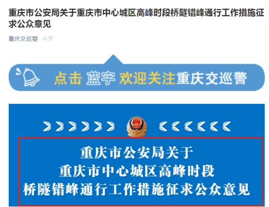 而就在今日(9月2日),重庆市公安局发布了关于重庆市中心城区高峰时段桥隧错峰通行工作措施征求公众意见。征集意见时间为2020年9月2日至2020年10月2日,公众可以通过电子邮件或者传真的方式反馈意见或者建议。