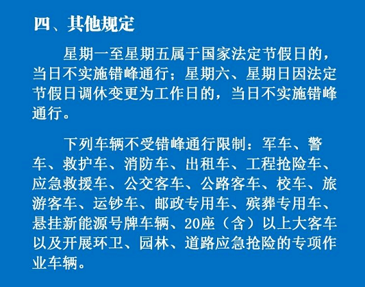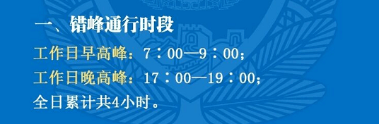 至于错峰通行的时段,主要集中在工作日的早高峰:7;00——9:00;工作日的晚高峰:17:00——19:00,全日累计共4个小时,不在该时间段内的车辆可以正常出行。