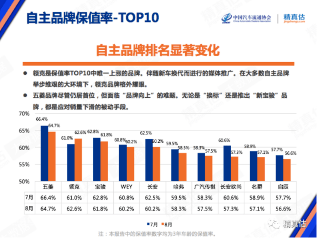 自主品牌方面,五菱品牌仍居首位,不过面临“品牌向上”的难题依旧急需解决。而在大多数自主品牌举步维艰的大环境之下,领克品牌格外耀眼,成保值率TOP10中唯一上涨的品牌,一方面由于本身产品力突出,得到消费者认可;另一方面,则由于品牌自身一步到位的定价策略,为产品后期保值奠定了良好的基础。