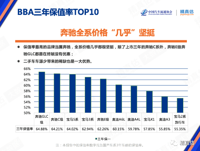 而在BBA品牌三年保值率中,保值率最高的依旧是奔驰品牌,其中光TOP 5中就有3款车型来自奔驰,包括奔驰GLC、奔驰C级和奔驰E级;另外,宝马5系和宝马3系也在TOP5中,保值率为62.02%和62.94%;奥迪A6L和奥迪A4L则为60.15%和59.85%。