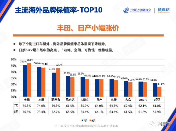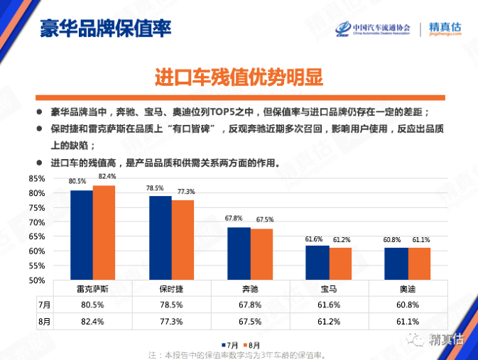 在豪华品牌保值率中,奔驰、宝马和奥迪位列TOP 5中,但是保值率与进口品牌仍存在一定的差距。当然,主要还是因为进口车的产品品质以及供需层面的缘故。其中保时捷和雷克萨斯在品质上“有口皆碑”,二手车残值比较高,其中既不国产又加价的雷克萨斯,8月保值率高达82.4%,领先奔驰15个点,领先宝马和奥迪21个点,优势十分明显。