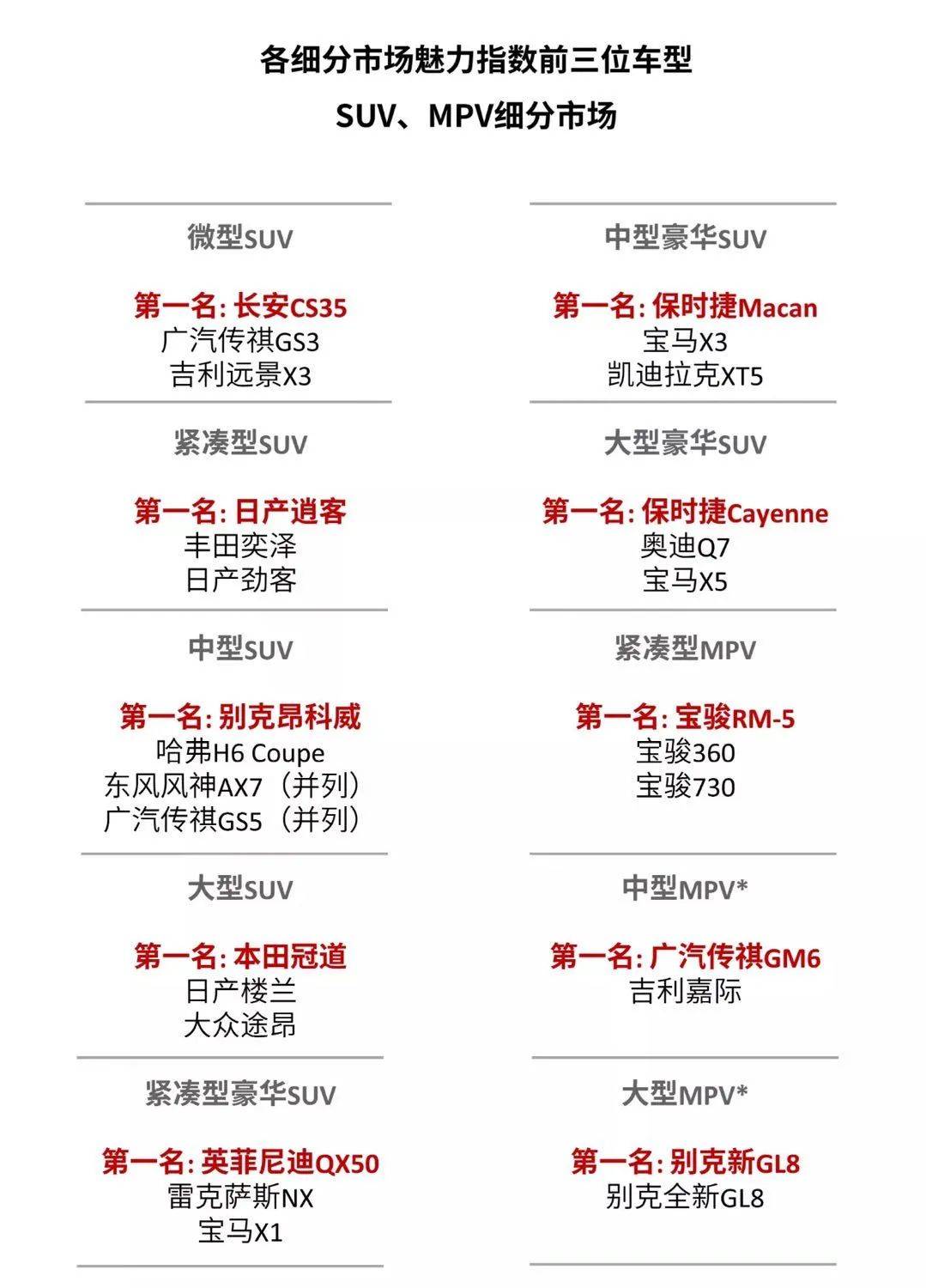 从前面各大细分市场第一名的情况来看,汽车魅力指数研究还是具备一些购车参考性。诸如本田飞度、锋范、缤瑞、轩逸、奔驰E级、奥迪A6L、长安CS35、逍客、冠道、宝马X3、传祺GM6、别克GL8等等,它们的终端销量也在各自细分市场处于前列,这也在一定程度上证明了榜单的权威性。