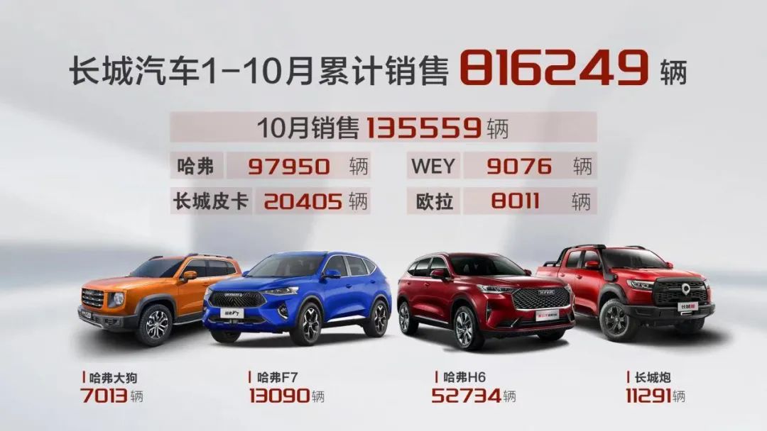 今日(11月6日),长城汽车对外发布了今年10月份的销量数据。数据显示,今年前10个月,长城汽车累计销量达81.62万辆,其中,长城汽车10月销量超13.55万辆,同比增长18%,再创月度销量新高。下面,就跟圈哥来进一步了解一下各大品牌的销量情况吧!