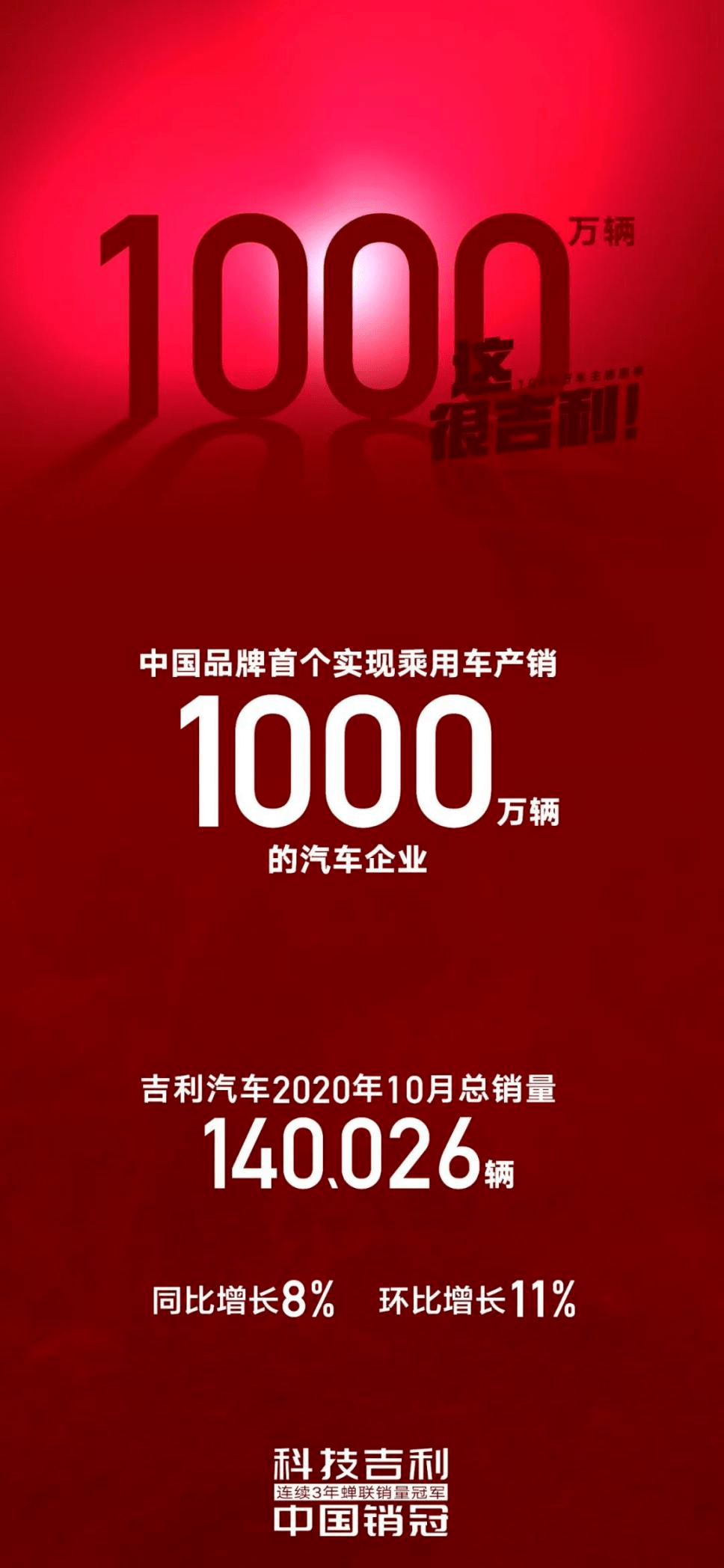 最近几天,圈哥的朋友圈被吉利汽车销量突破1000万辆刷屏了。在刚过去的10月份,吉利汽车总销量为140026辆,环比增长约11%、同比增长约8%。截至2020年10月底,吉利汽车全球累计销量顺利突破1000万辆,成为首个实现乘用车产销1000万辆的中国品牌车企。