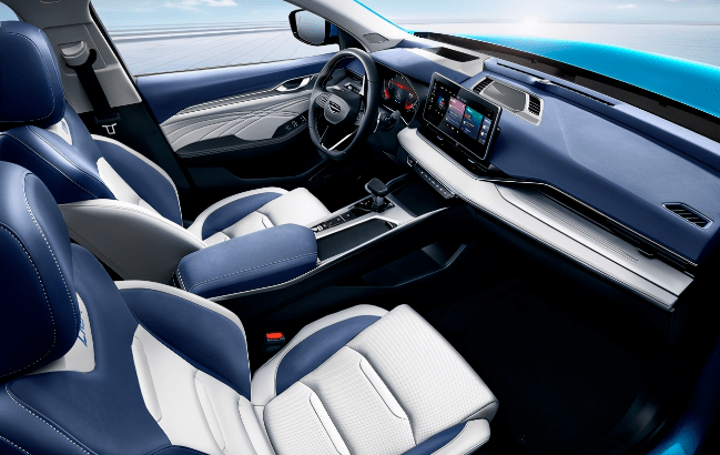 进入车内之前必做的一个动作就是拉门把手打开车门,虽然关门的感觉厚不厚重并不能作为一辆车品质好不好的参考因素,但是从拉门把手的手感和关门的平顺中还是能够感受到国产车工艺水准有了很大的提升。车内的整体设计是非常舒服的简约科技风,加上游艇蓝和灰色的双拼搭配,让车内还透露出一股松弛的家具风。
