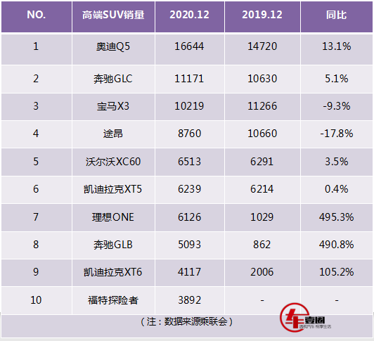 日前,乘联会公布了12月份高端豪华SUV的最新销量数据。从榜单来看,虽然大部分车型依旧是“老面孔”,但是整体排名相较于以往还是出现了一定的变化。具体来看,豪华SUV奥迪Q5L当月终于争了口气,把劲敌奔驰GLC拉于马下,并且甩出其超5000辆,至于宝马X3依旧是居于季军位置。当然,榜单内还出现了不少高端SUV“新面孔”,比如理想ONE以及福特探险者等。下面,圈哥就带大家看看具体的排名情况以及排名出现较大变动的原因。