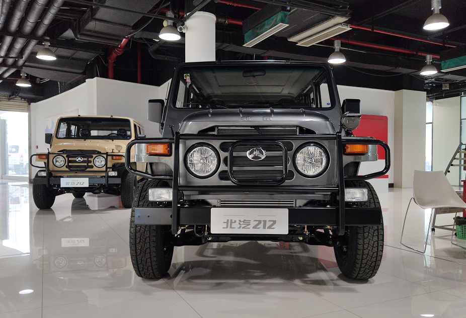 新款BJ 212的车头设计依然保留了几十年前的野性设计风格,经典圆头大灯使用的是卤素灯光,在LED车灯满天飞的年代反而看上去很亲切,也颇具复古风格。值得一提的是,新款 BJ 212依旧保留了第一代车型上的防空灯设计,看起来非常个性。为了传承BJ 212的设计精髓,新车进气中网并没有采用常见的镀铬塑料材质,依旧是钢板冲压件制成,搭配上厚实的引擎盖和粗壮的黑色保险杠,不只看起来硬派,触感也相当厚重。