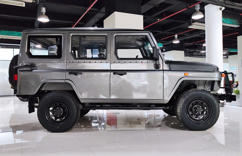 新车相比老款车型最明显的改动就是车辆侧面,车身长度进行了加长,方门版车型总长度达到4245毫米,轴距加长到2460毫米,不仅带来了更强烈的气场,而且后排乘客腿部空间也会有所增大。此外,新车最低离地间隙达到了215毫米,离去角也比一般SUV更大,通过性更有保障。