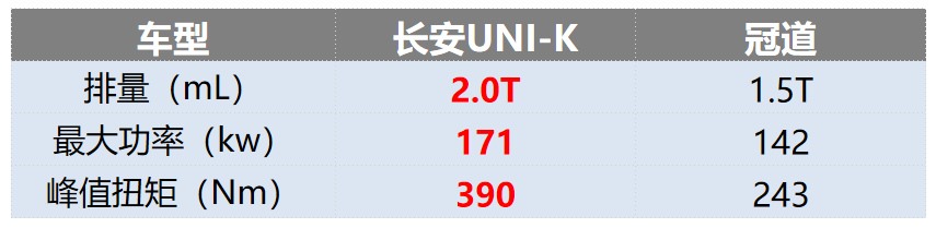 既然是中大型SUV,那么对动力的要求一定要高。长安UNI-K率先搭载了蓝鲸新一代2.0T+爱信8AT这一动力总成,且全系标配。该发动机集成了350bar高压直喷、奥拓/阿特金森双循环等20余项先进技术,最大功率达171千瓦,峰值扭矩达390牛米,比冠道参数表现更优。花更少的钱,就能买到更强的动力,放眼整个15万级市场上,这样的动力表现堪称最强组合。