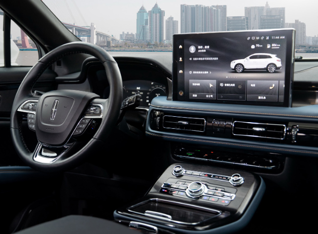 在车内,新一代林肯航海家的整体风格是很熟悉的林肯最新家族化设计。整个中控台被贯穿式的空调出风口上下分层,呈现出错落有致的前卫气息。在上半部有12.8英寸的悬浮式中控屏和12.3英寸的液晶仪表盘,在下半部是按键式的换挡机构和数量很多,但十分整洁的各种控制按键。似乎林肯相比于“走捷径”的触控按钮,对物理按键更加青睐,新一代林肯航海家花了更多的心思将物理按键设计得更加精致,细节之处的镀铬以及整个布局都会让人感到强烈的高品质感。