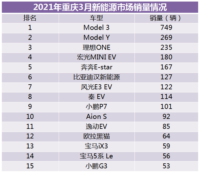 从3月新能源市场销量情况来看,有点值得关注,一是,特斯拉是实至名归的大赢家。Model 3单月销量达749辆,放在轿车市场来看的话,比朗逸销量更高,直逼长安逸动系列。除了Model 3之外,刚上市不久的Model Y也以269辆的成绩位居榜单第二位。二是,宏光MINIEV与奔奔Estar发力新能源代步车市场,效果也都不错,分别位居榜单第四、五位。三是,理想、小鹏等造车新势力表现稳定,但蔚来有些掉队了。值得一提的是,传统豪华车巨头宝马也一次性入围了两款车型,新能源开始有起色了。