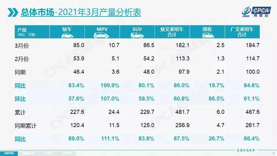 据乘联会公布的数据显示,3月份国内狭义乘用车市场销量达182.1万辆,同比增长86%,环比增长60.8%。其中,3月份轿车销量85万辆,同比增长83.4%,环比增长57.6%;3月份SUV销量86.5万辆,同比增长80.1%,环比下降59.5%;3月份MPV销量10.7万辆,同比增长199.9%,环比增长107%;3月新能源销量达到20.2万辆,环比增长101.1%,同比增长261.3%,呈现独立增长的良好态势。