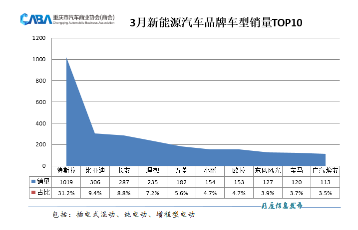 从具体的品牌来看,特斯拉、比亚迪、长安汽车分别位居榜单前三,销量分别为1019辆、306辆、287辆。有几点值得一说:一是特斯拉表现非常稳定,单月销量破千,实力领跑重庆新能源市场。二是,理想、小鹏稳定输出,蔚来稍微有点掉队;三是,出行市场销量的增加,带动了东风风光销量的增长。