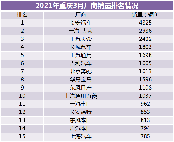重庆市场厂家销量排名情况