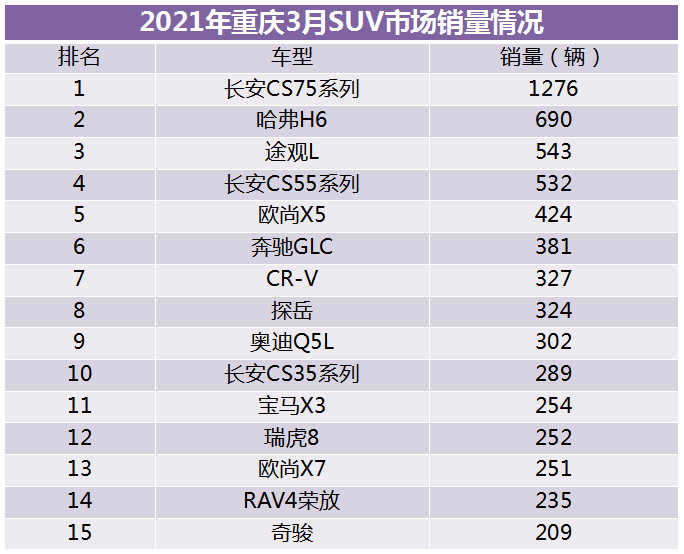 SUV市场销量排名情况