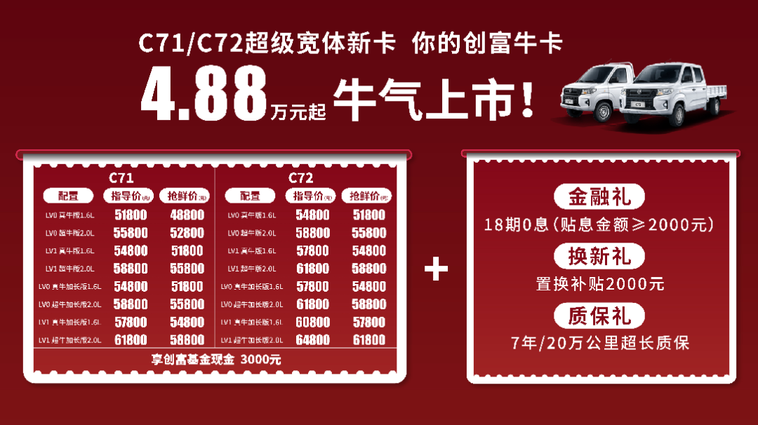 《车壹圈》观点:东风小康C71/C72的出现,进一步拉低中大型微卡的价格门槛,对于追求实用性的车主来说的确是个福音。它不仅价格低、载物能力强、配置多、动力性能出众,而且后期养护成本也低。加上7年/20万公里超长质保无论是日常使用,还是用来拉货东风小康C71/C72都是非常不错的选择。如果近期有购车打算,东风小康C71/C72值得重点关注!