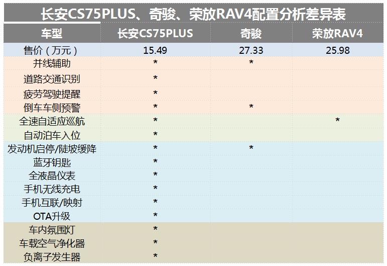 这里圈哥不得不佩服长安汽车的做法,即在高配置基础之上,更要打造高智能,来强化自身产品力。从表格上消费者不难发现,抛开三款车之间的价格差距,长安CS75PLUS依旧比奇骏、荣放RAV4等车型多出了并线辅助、道路交通识别、疲劳驾驶提醒、车内氛围灯等诸多智能科技配置。花十几万的价格,就能享受到同级合资车没有的智能科技配置,这样的体验感不是更爽?