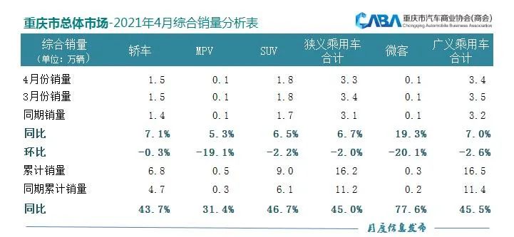 数据显示,重庆市场4月狭义乘用车销量达3.3万辆,同比增长6.7%,环比增长-2.2%。具体来看,轿车市场4月销量达1.5万辆,同比增长7.1%%;SUV市场4月销量达1.8万辆,同比增长6.7%;MPV市场4月销量达0.1万辆,同比增长5.3%。