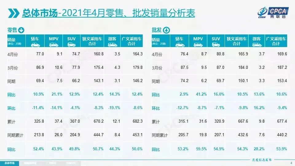 据乘联会公布的数据显示,4月份国内狭义乘用车市场销量达160.8万辆,同比增长12.4%,环比下降8.3%。其中,4月份轿车销量为77万辆,同比增长10.9%,环比下降11.4%;4月份SUV销量为74.7万辆,同比增长12.9%,环比下降4.1%;4月份MPV销量为9.1万辆,同比增长21.1%,环比下降14.1%;4月份新能源狭义乘用车销量为16.3万辆,同比增长192.8%,环比下降12.0%。