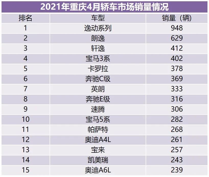 从轿车市场4月销量排名情况来看,长安逸动系列以948辆的成绩,蝉联了单月市场销冠的位置们,也会是唯一一个进入榜单的中国品牌车型。朗逸、轩逸紧随其后,销量分别为629辆与412辆。诸如卡罗拉、英朗、速腾、宝来等老面孔也不用多说,稳定在榜单是没有问题,更多的是排名的变化。值得一提的是,在消费升级的带动下,BBA在重庆市场表现非常之好,每个品牌都各自入围了两款车型,奥迪也终于赶上大部队了,毕竟以前仅奥迪A4L一款车型入围。
