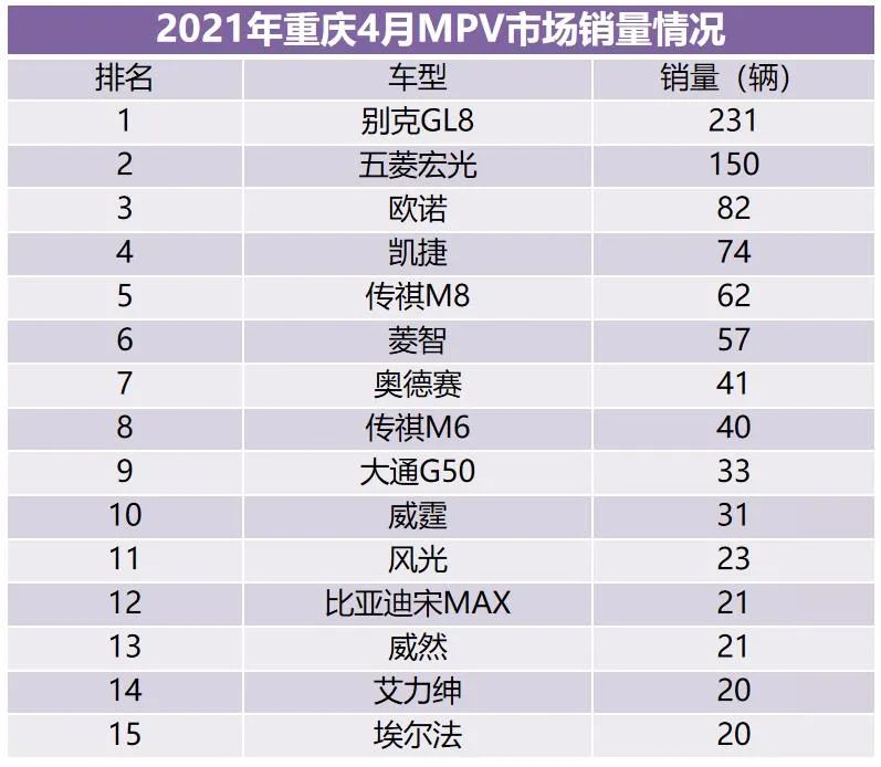重庆MPV市场销量排名情况