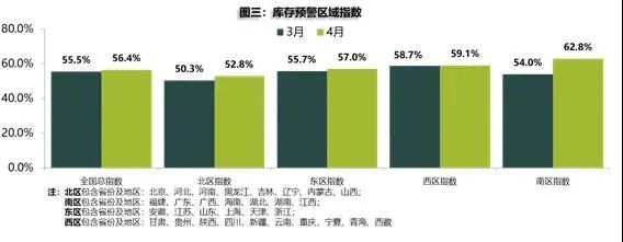 数据显示,4月份,全国汽车经销商库存预警指数为56.4%,较上月上涨0.9个百分点,对比去年微降0.4个百分点,库存预警指数位于荣枯线之上,汽车市场处在不景气区间。4月全国总指数为56.4%,北区指数为52.8%,东区指数为57.0%,西区指数为59.1%,南区指数为62.8%。