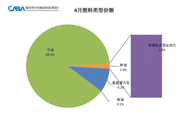 从4月销售车型的燃料类型来看,重庆市场依旧是以燃油车为主,占比达到了88.6%。其中,新能源车型4月销量环比略微提升,占比达9.2%,这是一个不错的信号,未来发展潜力更加值得期待。