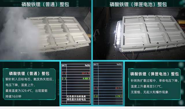 本次试验,采用磷酸铁锂(普通电池)整包和磷酸铁锂(弹匣电池)整包进行对比测试。试验条件同样选择了国标最严苛的试验条件,通过8毫米直径的钢针,直接对两款磷酸铁锂电池进行了针刺试验。