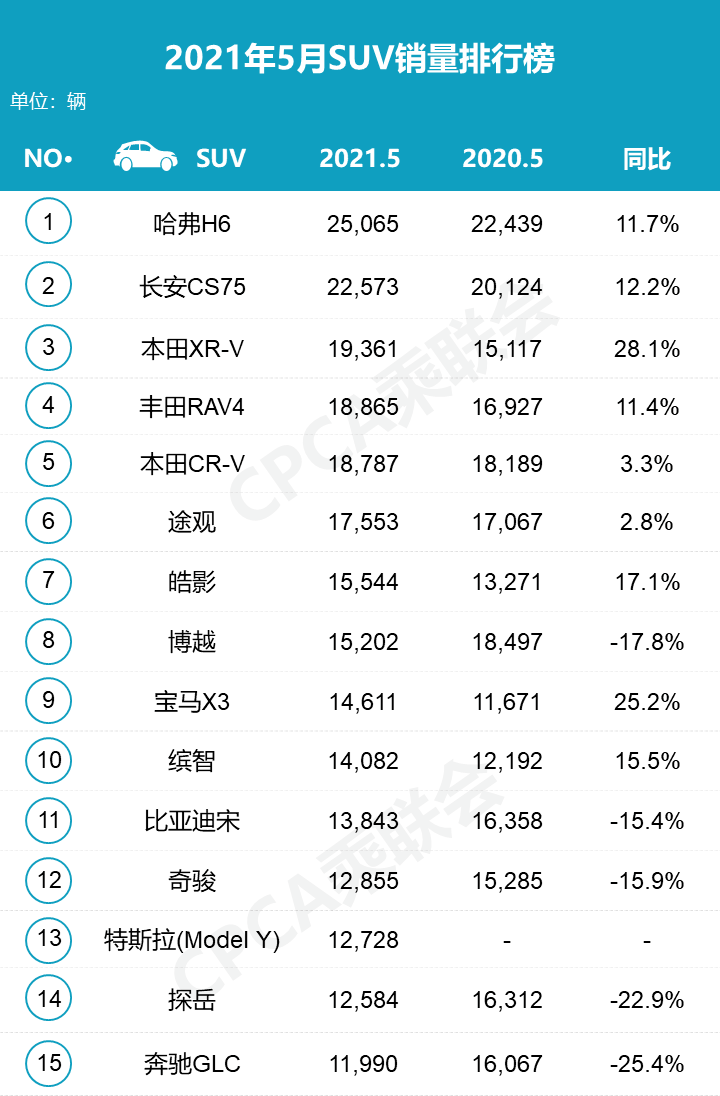 与4月份相比,5月SUV市场销量排名变化较大:哈弗H6重回销冠,XR-V、丰田RAV4销量超越CR-V,特斯拉Model Y也强势回归。