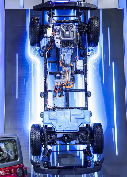 而且当你了解过它的动力之后,你会发现电机的加持并非仅仅为了节油而已。该车搭载的是一台2.0T发动机与双电机组成的动力总成,其综合最大功率为375马力,峰值扭矩达到了637牛米。是不是发现比燃油版要强上许多?难道这才是牧马人加上电机的目的?