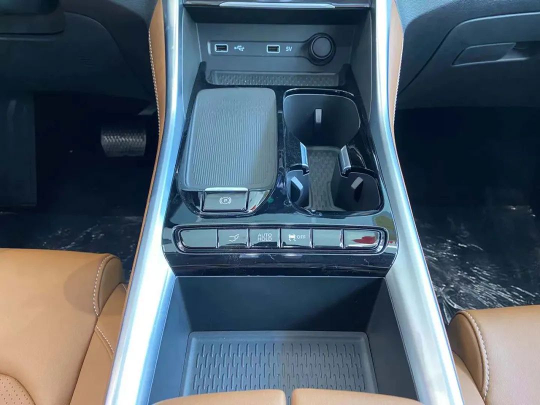 在前排, 由于G50 PLUS采用了怀挡设计,所以传统的挡把区域就完全留出来了。设计了两个杯架、一个储物空间、还有手机无限充电区域,而且布局相当规整,相当人性化。