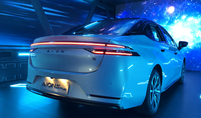 新车的车尾部分则采用时下流行的贯穿式分体尾灯,拉伸视觉宽度的同时,增加了层次感。为了降低风阻和风噪,复杂的线条无法出现,难免会使车尾显得乏味。但这样的尾灯设计就很好的弥补了这个不足,使AION S PLUS的车尾拥有了更高级的质感。