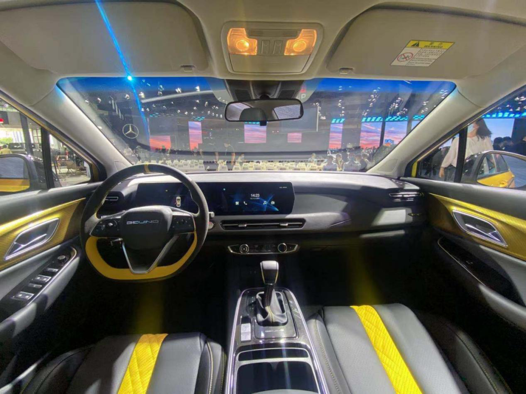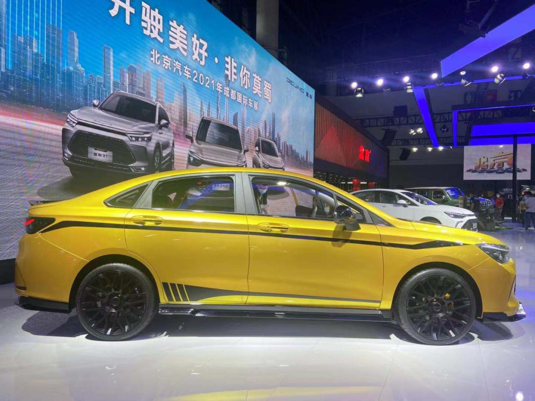 来到侧面,熏黑处理的窗框、贯穿整车的黑色拉花线条以及19寸的轮毂的加入让低趴的车身显得动感十足。来到尾部,突出的尾翼与熏黑前唇还有黑色哑光的LOGO进一步强调了北京U5 PLUS“金吾卫”的个性。