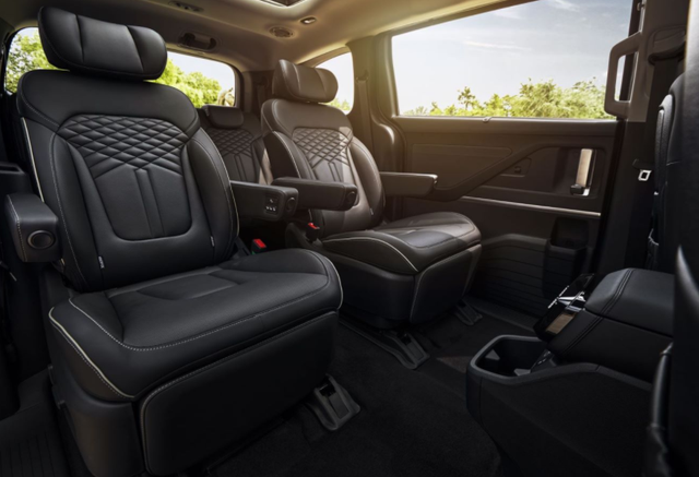 而作为一台MPV车型,最重要的当属乘坐体验。库斯途采用的2+2+3座椅布局,加上超长的轴距优势,第二排的两个独立座椅就显得非常宽大。首先第二排的两个座椅都采用了非常厚实的皮质包裹,同时具备腿托,两侧均有可调节的扶手,硬件上已经满足舒适乘坐的基本需求。该车还具备10向电动调节,尤其是一键即可调节座椅至90度、110度以及135度三种角度,着实非常人性化,充分考虑到了上下方便、舒适乘坐等实用方面。