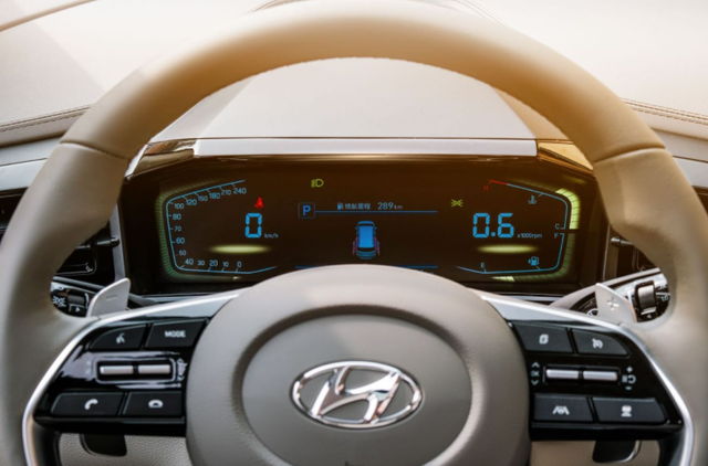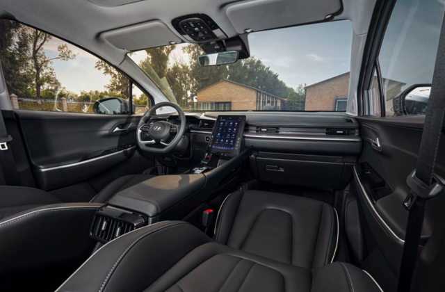 进入车内,可以看到北京现代最新车型熟悉的设计风格。10.4英寸的中控屏是非常具有科技感的,采用了竖状的设计,集成了屏幕内容和操作键,也因此就没有多余的物理按键。而比较有特色的是贯穿式空调出风口将整个中控台一分为二,同时10英寸的数字仪表盘也像镶嵌在空调出风口上,呈现出了一体化的视觉效果。