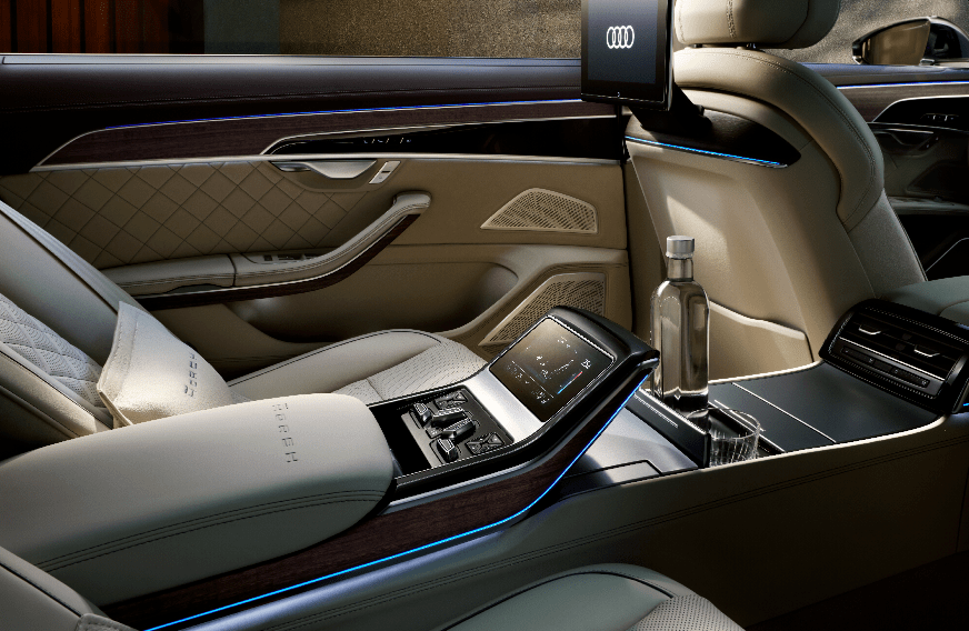 全新奥迪A8L Horch创始人版相比现款A8L轴距增加了130毫米,并且全部用于提升后排空间,双倍加强的座椅填充物以及8种不同的按摩模式的前/后排座椅按摩功能、带有隐藏式可升降声学棱镜的B&O高端音响、后排化妆镜、底部厚绒地毯、以及视野更开阔的全景天窗,营造出了超越头等舱的奢适体验。