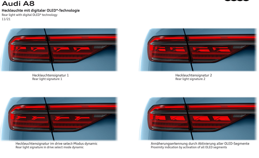 OLED尾灯则更加出彩,可以看到新款奥迪A8的尾灯可以支持4种完全不同的显示效果,其显示质感和细腻度相比传统LED尾灯有质的飞跃,就像PS2与小霸王的区别,也许下一代奥迪车型能用尾灯形成文字信息也说不定。