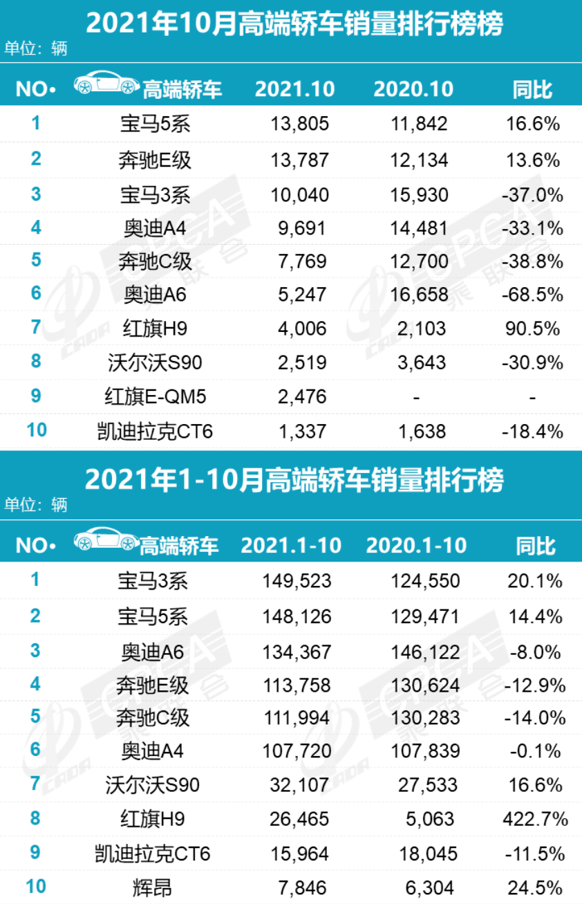 11月9日,乘联会公布了最新的乘用车销量数据。据数据显示,我国10月狭义乘用车市场销量达171.4万辆,同比下降14.0%,环比增长8.4%。整体依旧呈现同比下降、环比增长的趋势。其中高端车型多数呈下滑趋势,但其中不乏一些主销车型仍然保持了增长态势,例如宝马5系和奔驰E级,尤其是同比增长90%以上的红旗H9表现都非常优异。今天圈哥就带大家简单了解并分析一下10月高端车型销量情况。