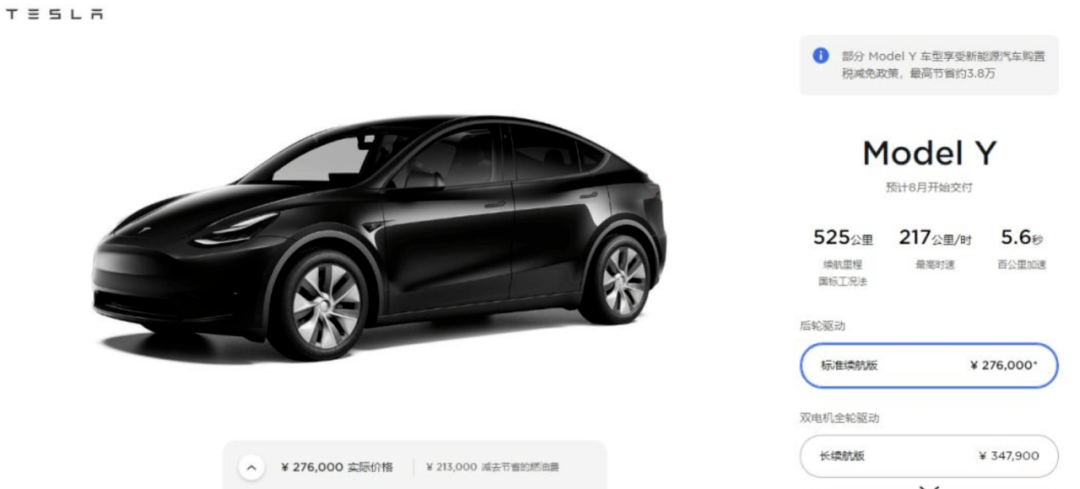 我们简单看下Model Y的产品力,4750/1921/1624毫米的尺寸,轴距为2890毫米,典型的纯电SUV短车身长轴距设计,兼顾空间与操控。30.184-38.79万元的售价包含三种车型,入门款为单电机后驱,零百加速不到7秒,60度电池续航达到了545公里,刚上市的时候入门版车型补贴后售价仅为27.9万元。极具竞争力的价格使其火爆至今。